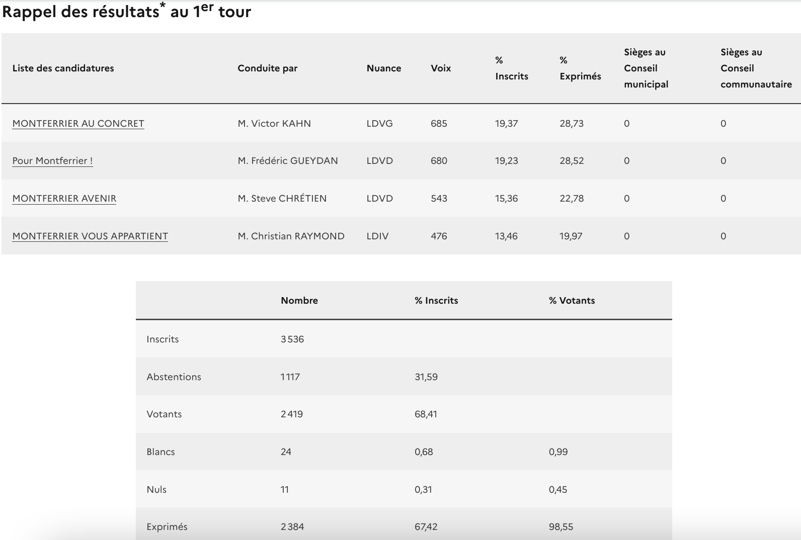 À Montferrier, le nombre de votants a été de 68,41% au 1er tour, 70,02% au 2e tour. En France, le taux de participation a été de 57,1% au 1er tour et de 57,03% au 2e tour. Ce fort taux de participation par rapport à la France (+ 10%) se singularise également par une légère hausse entre les deux tours (+ 1,61%) à Montferrier alors qu’en France ce % baisse très légèrement : -0,07.