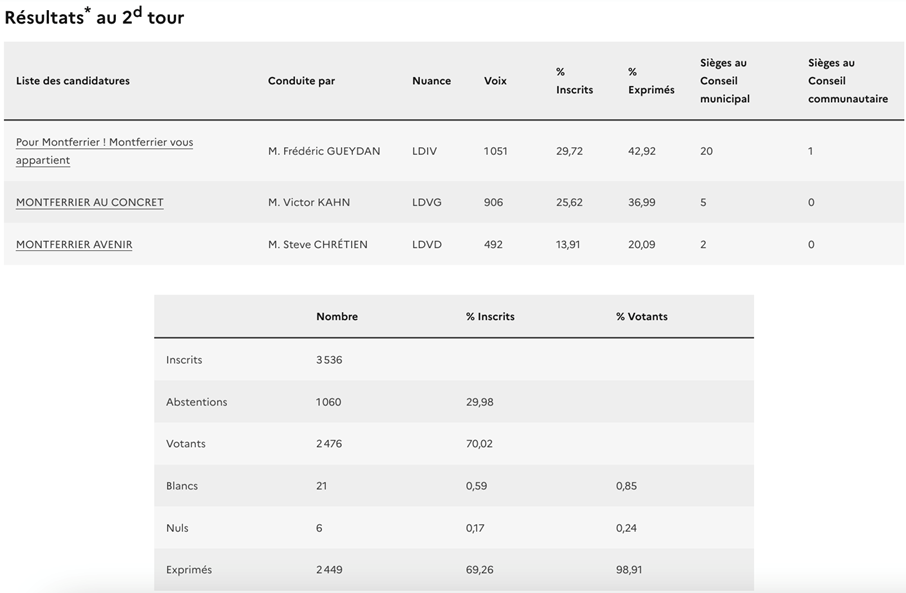 En valeur absolue, ce sont 1117 inscrits (31,59%) qui ne sont pas allés voter au 1er tour, mais seulement 1060 (29,98%) au 2e tour. Sur un total de 3536 inscrits, cela représente tout de même près d’1/3 des inscrits. F. Gueydan, notre maire aujourd’hui, a obtenu 1051 voix (29,72%) au 2e tour, tout juste un peu moins que le nombre d’abstentions : 1060 (29,98%), 9 voix de plus. Cela interroge, pour le moins.