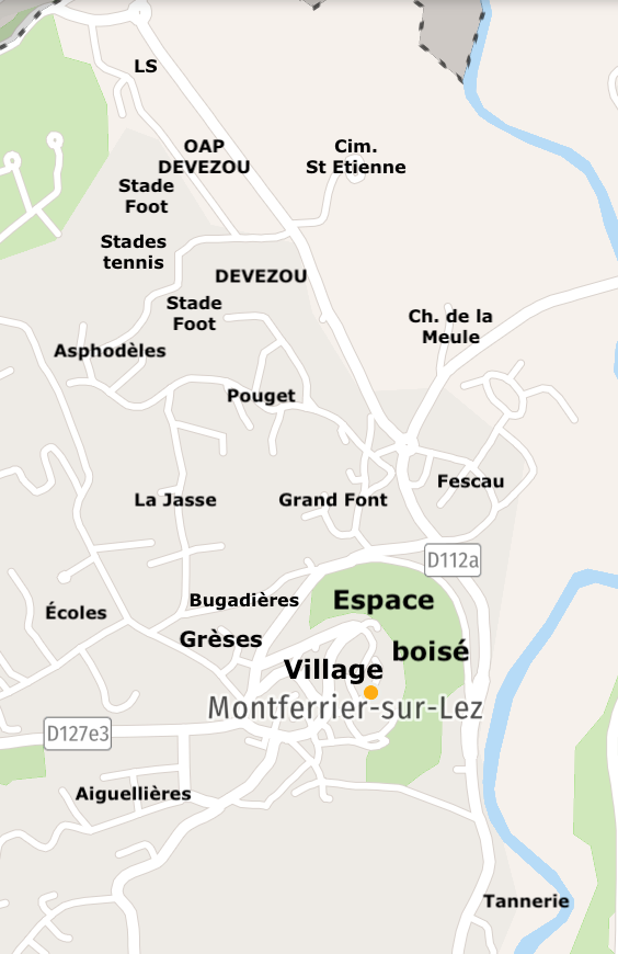 Afin d’envisager certains réaménagements (déplacements des terrains de foot, voire de la mairie, difficile d’accès, ou autre – écoquartier, maison de santé…), ces terrains pourraient faire l’objet d’un reclassement dans le PLUI. Cet emplacement permettrait, d’une part de recentrer la commune entre le hameau de Baillarguet et Montferrier-village, d’autre part de présenter une continuité urbaine entre Fescau et Devezou (OAP en cours), enfin de permettre au bois du Devezou (entre ces terrains aujourd’hui agricoles et le cimetière St Etienne) de faire l’objet d’un aménagement paysager comme celui du bois de Montmaur à Montpellier. Ce projet, par son ampleur, ferait l’objet d’une concertation citoyenne, comme les autres grands projets communaux.