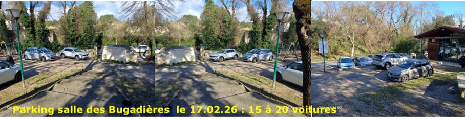 Rue des Bugadières, la majorité actuelle a décidé la construction d’un bâtiment R+1 en continuité du « chalet ». Y seront installés, l’activité danse avec d’autres activités (yoga, fitness, pilate) au RDC et des salles au 1er étage (mairie annexe, salles pour les associations) sans que cela ne soit bien fixé encore. Se poseront des problèmes de parking, comme le souligne la photo ci-après, prise un mardi matin, et de circulation automobile, particulièrement rue des Bugadières. Fin février 2026 rien n’a encore commencé.